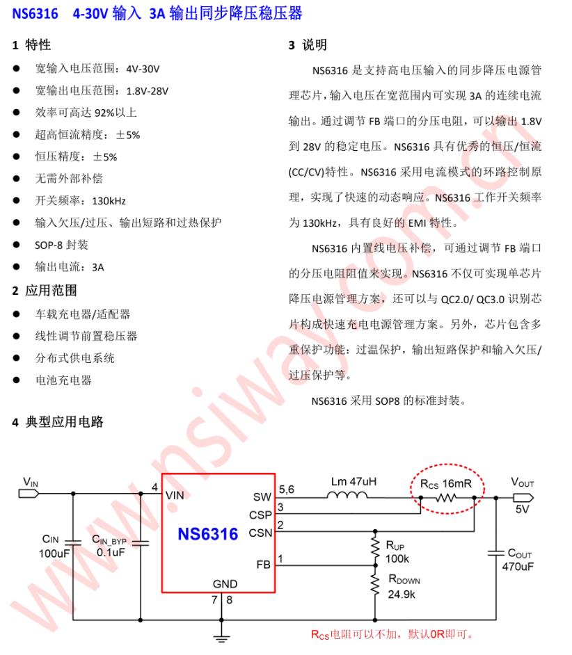 NS6316內置線電壓補償,可通過調節FB端口的分壓電阻阻值來實現。NS6316不僅可實現單芯片降壓電源管理方案,還可以與QC2.0/QC3.0識別芯 片構成快速充電電源管理方案。另外,芯片包含多重保護功能:過溫保護,輸出短路保護和輸入欠壓/ 過壓保護等。