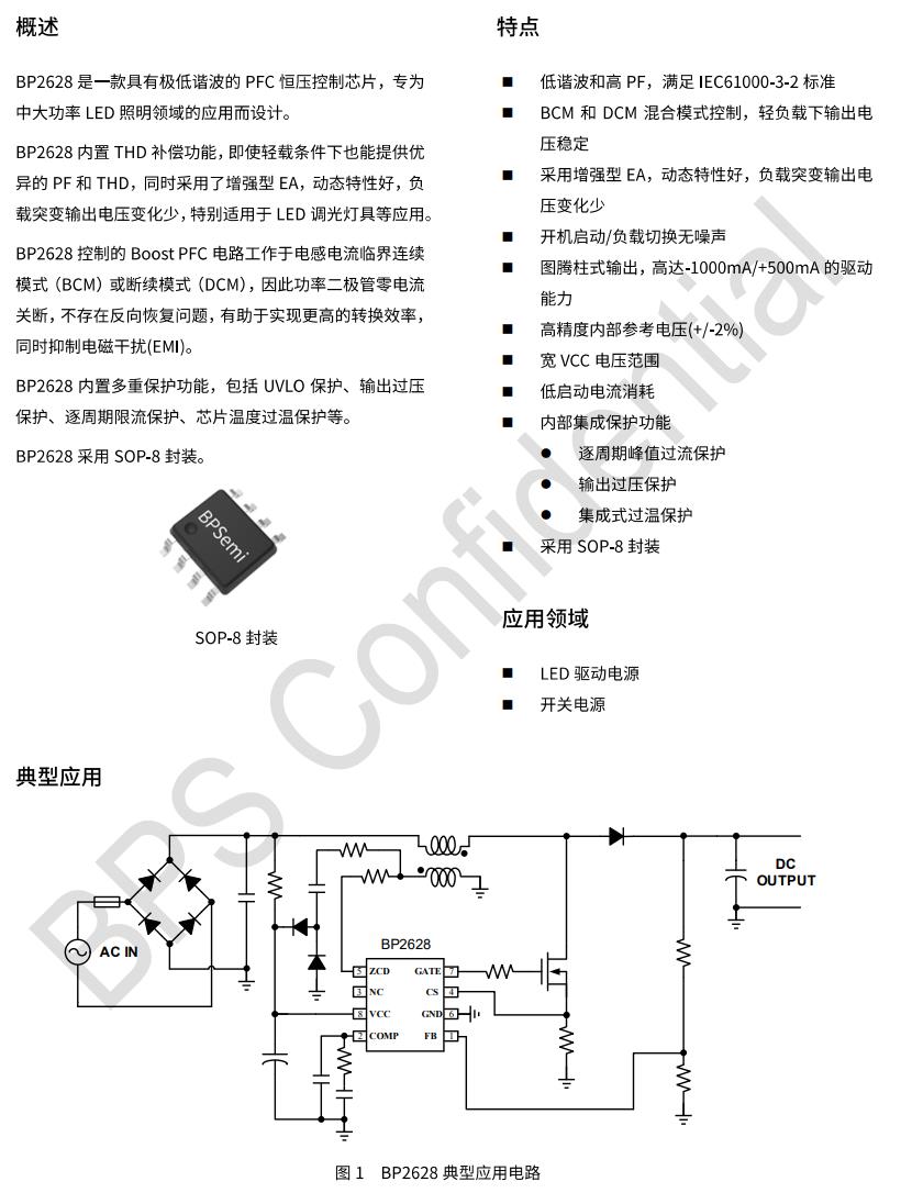 BP2628控制的Boost PFC電路工作于電感電流臨界連續模式(BCM)或斷續模式(DCM),因此功率二極管零電流關斷,不存在反向恢復問題,有助于實現更高的轉換效率,同時抑制電磁干擾(EMI)。BP2628內置多重保護功能,包括UVLO保護、輸出過壓保護、逐周期限流保護、芯片溫度過溫保護等。BP2628采用SOP-8封裝。
