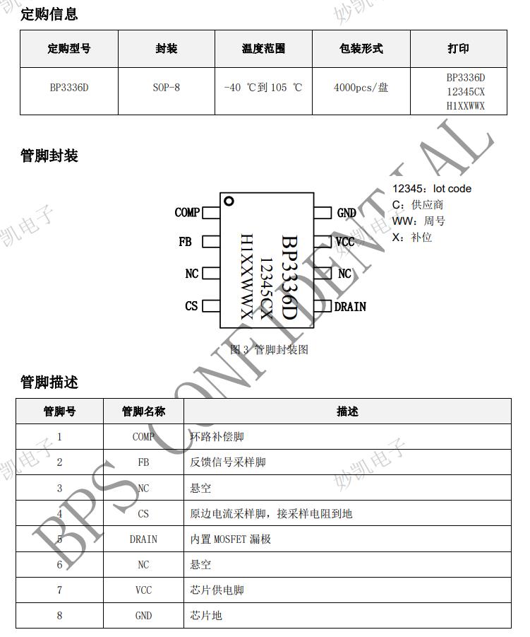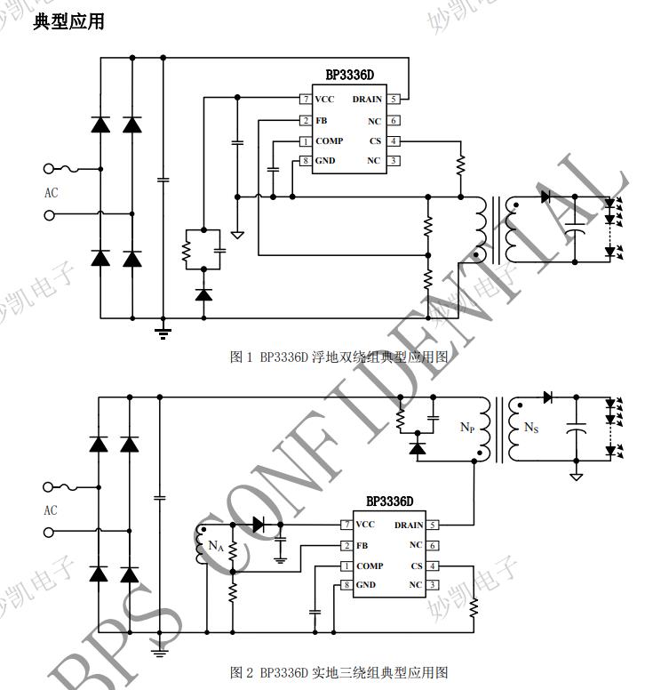 BP3336D 內置輸入電壓和負載補償線路,可以實現 極佳的線性調整率和負載調整率。 BP3336D 可以支持單繞組浮地 Buck-boost 或者兩 繞組/三繞組的隔離 Flyback 拓撲。 BP3336D 采用 SOP-8 封裝。