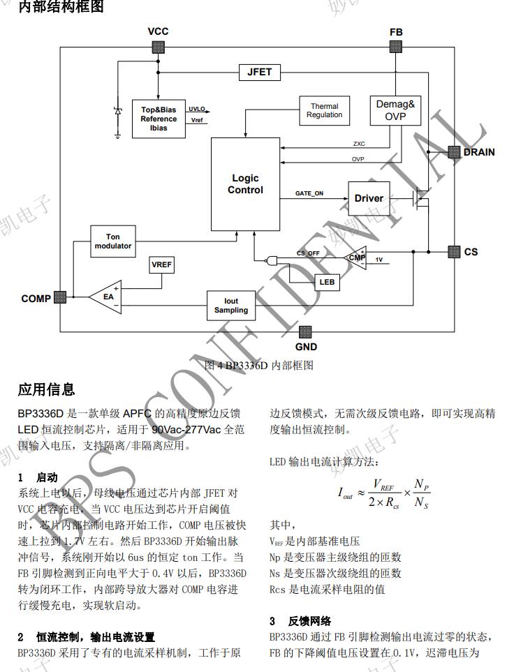 BP3336D 是一款單級 APFC 的高精度原邊反饋 LED 恒流驅動器,內置 650V 高壓 MOSFET,適用于 90Vac-277Vac 全范圍輸入電壓。 BP3336D 芯片采用固定導通時間的控制機制,能夠 實現高功率因數。內置 THD 優化模塊可以進一步 降低了 THD,針對全電壓輸入,可以實現 THD<15%。 開關工作在臨界導通模式,降低開關損耗及 EMI。 BP3336D 內置高壓啟動,搭配快速啟動控制,可以 在全電壓輸入下實現小于 500ms 以內的啟動時間。