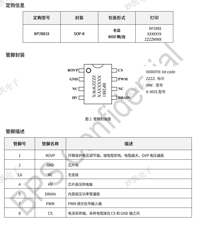 優勢 集成600V超快恢復續流二極管 支持1%-100%PWM 調光 全程模擬調光無頻閃 低待機功耗,待機電流100uA 無需啟動電阻和VCC電容 內部集成500V功率管 ±5%LED 輸出電流精度 LED開路保護 LED短路保護 過熱調節功能 采用SOP-8封裝