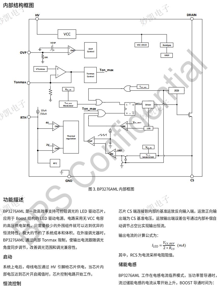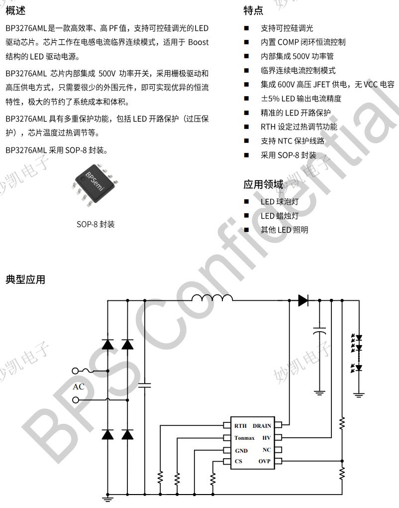 BP3276是一款高效率高P值支持可控硅調光的LED驅動芯片。芯片工作在電感電流臨界連續模式,適用于Boost結構的LED 驅動電源。 BP3276C芯片內部集成500V功率開關,采用柵極驅動和高壓供電方式,只需要很少的外圍元件,即可實現優異的恒流特性,極大的節約了系統成本和體積 BP3276具有多重保護功能,包括LED開路保護(過壓保護),芯片溫度過熱調節等。 BP3276采用SOP-8 封裝。