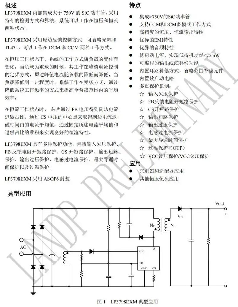 LP3798EXM內(nèi)部集成大于750V的SiC功率管,采用特有的檢測(cè)方式和算法,系統(tǒng)可以工作在恒壓和恒流兩種狀態(tài)。