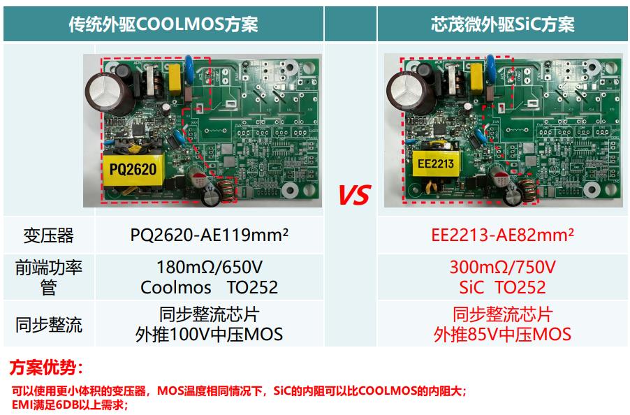 可以使用更小體積的變壓器,MOS溫度相同情況下,SiC的內阻可以比COOLMOS的內阻大; EMI滿足6DB以上需求;