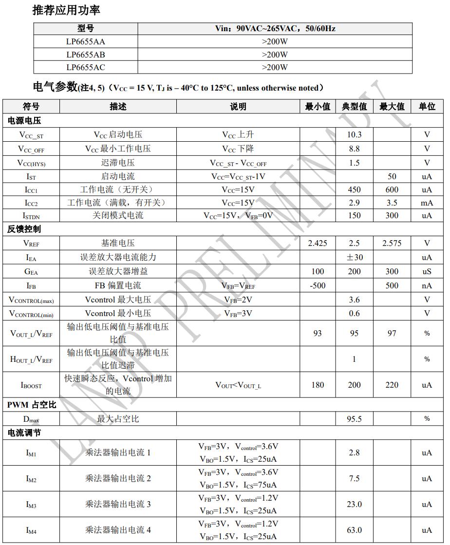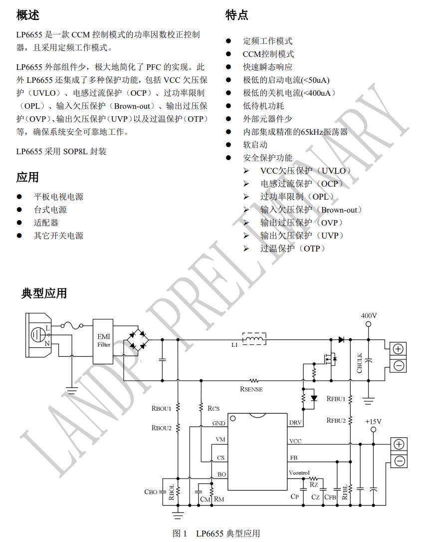 LP6655 是一款 CCM 控制模式的功率因數校正控制  器,且采用定頻工作模式。  LP6655 外部組件少,極大地簡化了 PFC 的實現。
