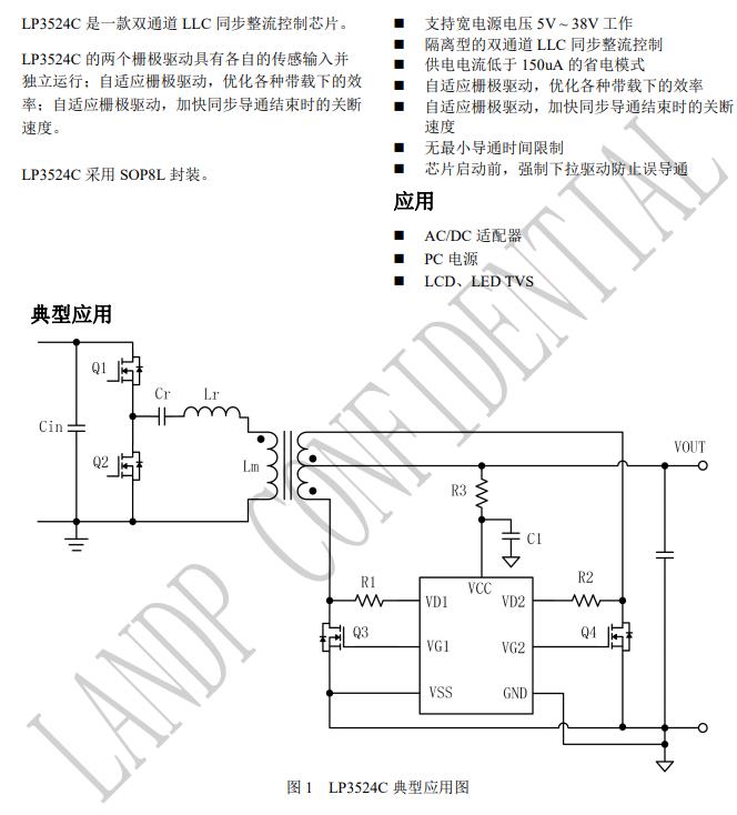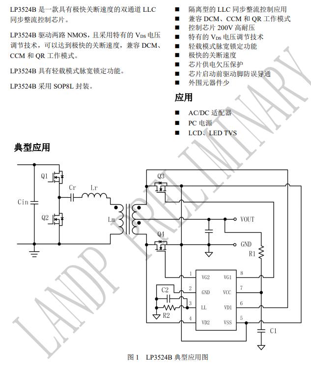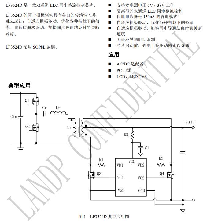 LP3524B 是一款具有極快關斷速度的雙通道 LLC 同步整流控制芯片。 LP3524B 驅動兩路 NMOS,且采用特有的 VDS電壓 調節技術,可以達到極快的關斷速度,兼容 DCM、 CCM 和 QR 工作模式。