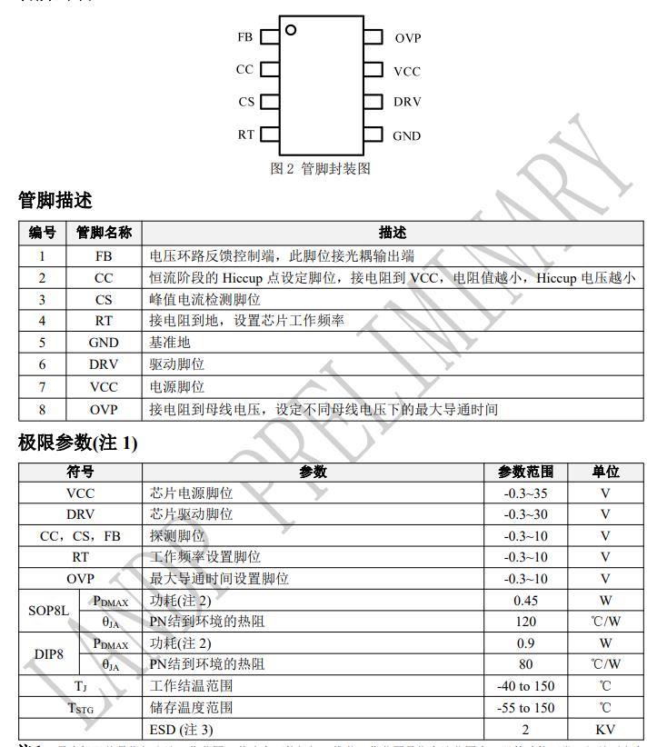 特點  ? 恒壓恒流正激控制器  ? 抖頻技術優化 EMI  ? 優異的音頻特性  ? 內置斜坡補償  ? 外置電阻,可調工作頻率,最大 500KHz  ? 內置軟啟動,防止啟機過沖