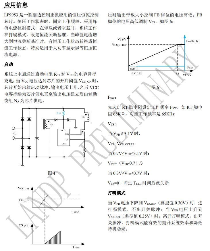 LP9953 外置電阻,可調工作頻率,最大工作頻率可  到 500KHz;LP9953 內置軟啟動,防止啟機過沖;  LP9953 在 CCM 模式下,具有最大輸出電壓恒定功  能,確保不同輸入電壓且帶載異常狀態下最大輸出  電壓保持恒定;內置抖頻功能優化 EMI;