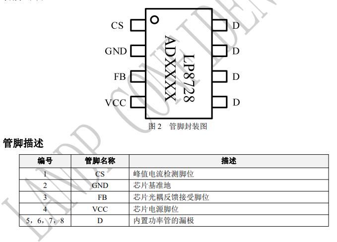 LP8728 具有多重保護(hù)功能,包括 VCC 欠壓保 護(hù),VCC 過壓保護(hù),輸出過載保護(hù)、輸出同步整流 短路保護(hù),CS 電阻短路保護(hù),過溫保護(hù)等功能。
