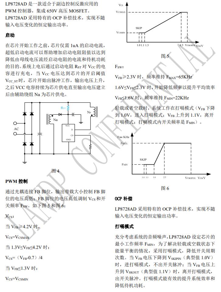 LP8728 是一款適合于副邊控制反激應(yīng)用的 PWM 控制器,集成 650V 高壓 MOSFET。 PWM 工作狀態(tài)時,采用峰值電流控制模式,并且 在中載以下開始降低頻率以提升平均效率,在輕載 或者空載時,系統(tǒng)工作在打嗝模式。