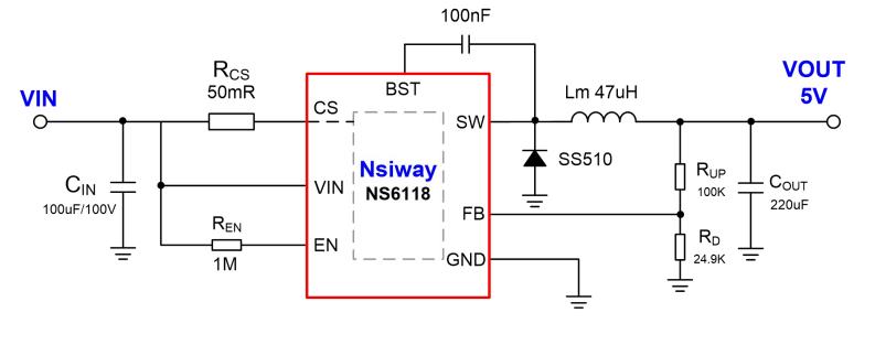 NS6118 是一款支持寬電壓輸入的異步降壓 DC-DC 穩壓芯片。內置有一個高邊 NMOS 管能夠提 供 2A 的輸出電流能力。NS6118 采用電流模式的環 路控制原理,實現了快速的動態響應。芯片還集成 有過溫保護,輸出短路保護和輸入欠壓保護等多重 保護功能。