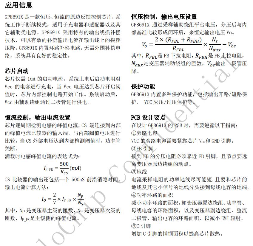 GP8691X是一款內置功率復合管,恒壓、恒流的原邊反饋QR導通控制芯片,適用于充電器和適配器。GP8691X采用特有的輸出線損補償技術,可以有效的補償輸出電流在輸出線上的損耗壓降。