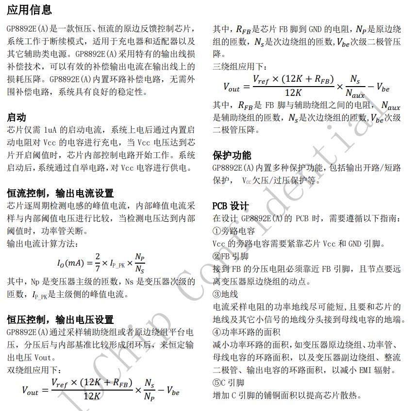 GP8892E(A)是一款自供電恒壓、恒流的原邊反饋控制芯片,適用于充電器和適配器。GP8892E(A)采用特有的輸出線損補償技術,可以有效的補償輸出電流在輸出線上的損耗壓降。