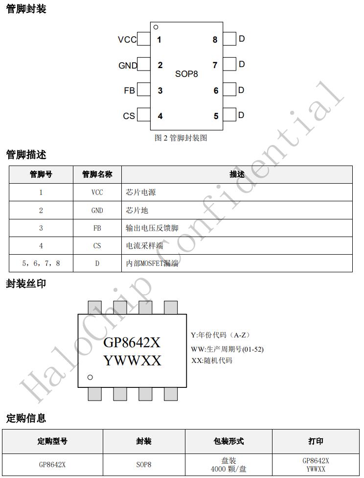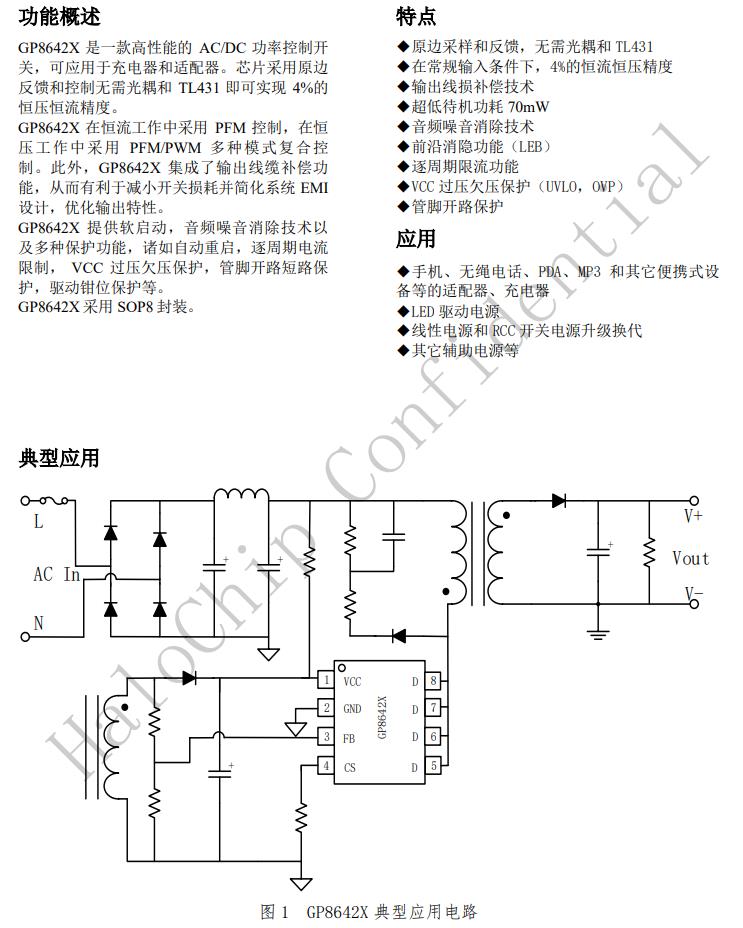 GP8642X是一款高性能的AC/DC功率控制開關,可應用于充電器和適配器。芯片采用原邊反饋和控制無需光耦和TL431即可實現(xiàn)4%的恒壓恒流精度。