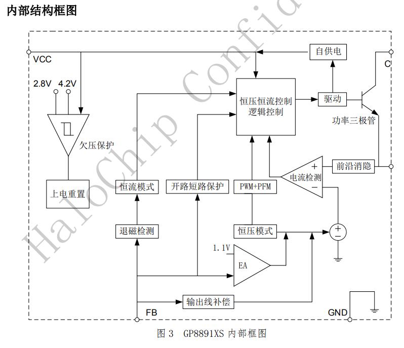 GP8891XS是一款自供電恒壓、恒流的原邊反饋控制芯片,適用于充電器和適配器。GP8891XS采用特有的輸出線損補(bǔ)償技術(shù),可以有效的補(bǔ)償輸出電流在輸出線上的損耗壓降。GP8891XS內(nèi)置啟動(dòng)電路,無需外圍啟動(dòng)電阻,內(nèi)置FB下偏電阻及CS采樣電阻,外圍更簡潔。GP8891XS內(nèi)置環(huán)路補(bǔ)償電路,無需外圍補(bǔ)償電路,系統(tǒng)具有良好的穩(wěn)定性。GP8891XS可以實(shí)現(xiàn)良好的恒壓、恒流特性,滿足待機(jī)功耗小于75mW。GP8891XS具有多重保護(hù)功能,包括開路保護(hù),過壓保護(hù),輸出短路保護(hù),次級(jí)肖特基短路等功能。GP8891XS采用獨(dú)特的單周期最大電流關(guān)斷機(jī)制,可避免三極管過流導(dǎo)致的各種失效。GP8891XS采用SOP7封裝。