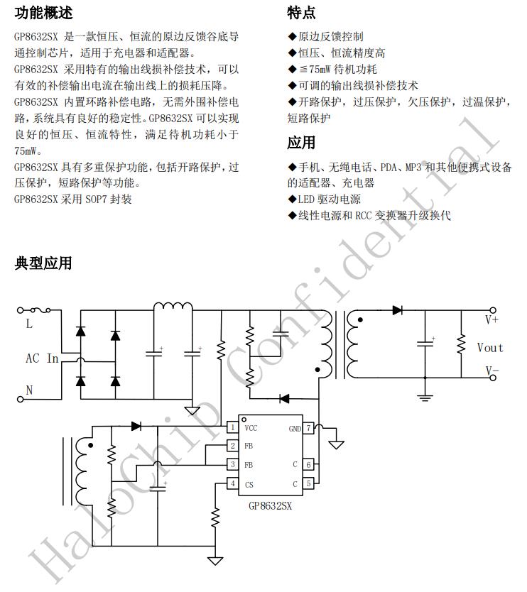 原邊反饋控制恒壓、恒流精度高≦75mW待機(jī)功耗可調(diào)的輸出線損補(bǔ)償技術(shù)開路保護(hù),過壓保護(hù),欠壓保護(hù),過溫保護(hù),短路保護(hù)