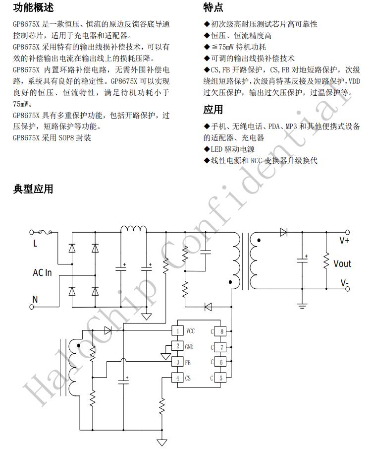 初次級(jí)高耐壓測(cè)試芯片高可靠性恒壓、恒流精度高75mW待機(jī)功耗可調(diào)的輸出線損補(bǔ)償技術(shù)CS,FB開路保護(hù),CS,F(xiàn)B對(duì)地短路保護(hù),次級(jí)繞組短路保護(hù),次級(jí)肖特基反接及短路保護(hù),VDD過欠壓保護(hù),輸出過欠壓保護(hù),過溫保護(hù)等。
