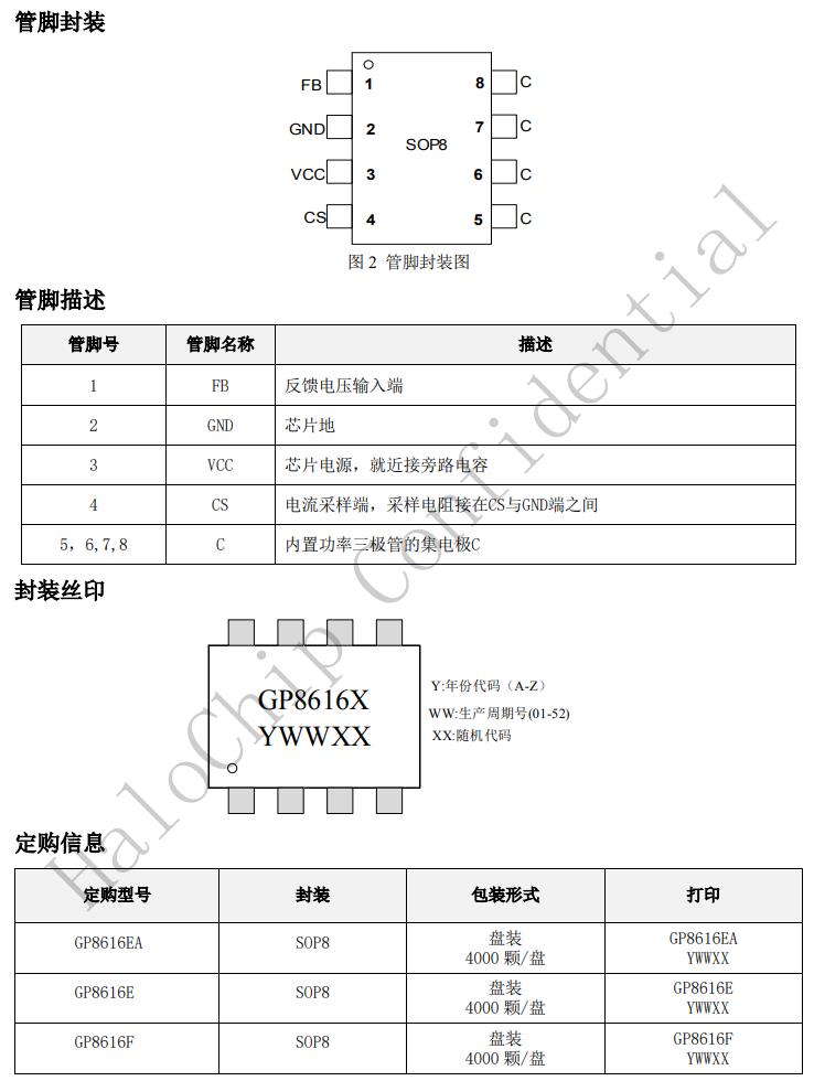 GP8616X具有多重保護功能,包括開路保護,過壓保護,短路保護等功能。GP8616X采用SOP8封裝