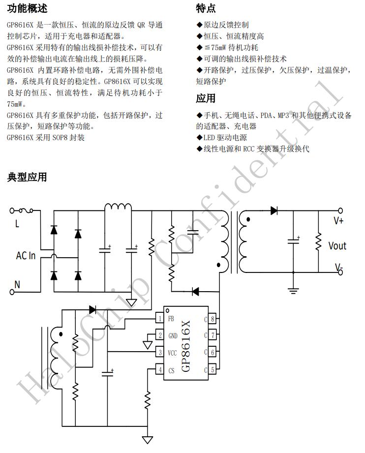 GP8616X是一款恒壓、恒流的原邊反饋QR導通控制芯片,適用于充電器和適配器。GP8616X采用特有的輸出線損補償技術,可以有效的補償輸出電流在輸出線上的損耗壓降。