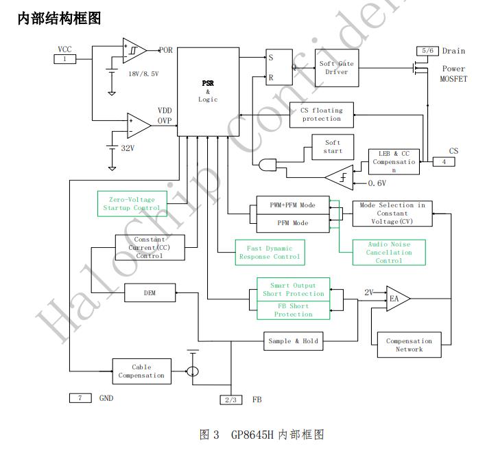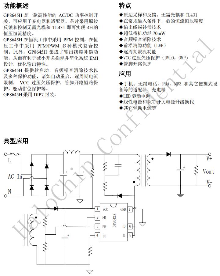 GP8645H是一款高性能的AC/DC功率控制開(kāi)關(guān),可應(yīng)用于充電器和適配器。芯片采用原邊反饋和控制無(wú)需光耦和TL431即可實(shí)現(xiàn)4%的恒壓恒流精度。