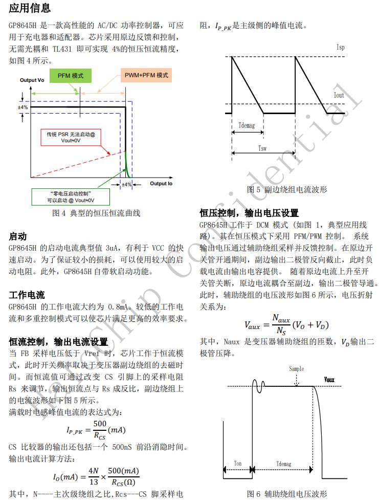 GP8645H在恒流工作中采用PFM控制,在恒壓工作中采用PFM/PWM多種模式復(fù)合控制。此外,GP8645H集成了輸出線纜補(bǔ)償功能,從而有利于減小開(kāi)關(guān)損耗并簡(jiǎn)化系統(tǒng)EMI設(shè)計(jì),優(yōu)化輸出特性。