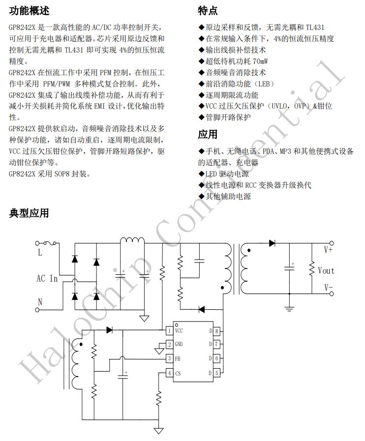 原邊采樣和反饋,無需光耦和TL431在常規輸入條件下,4%的恒流恒壓精度輸出線損補償技術超低待機功耗70mW音頻噪音消除技術前沿消隱功能(LEB)逐周期限流功能VCC過壓欠壓保護(UVLO,OVP)&鉗位管腳開路保護