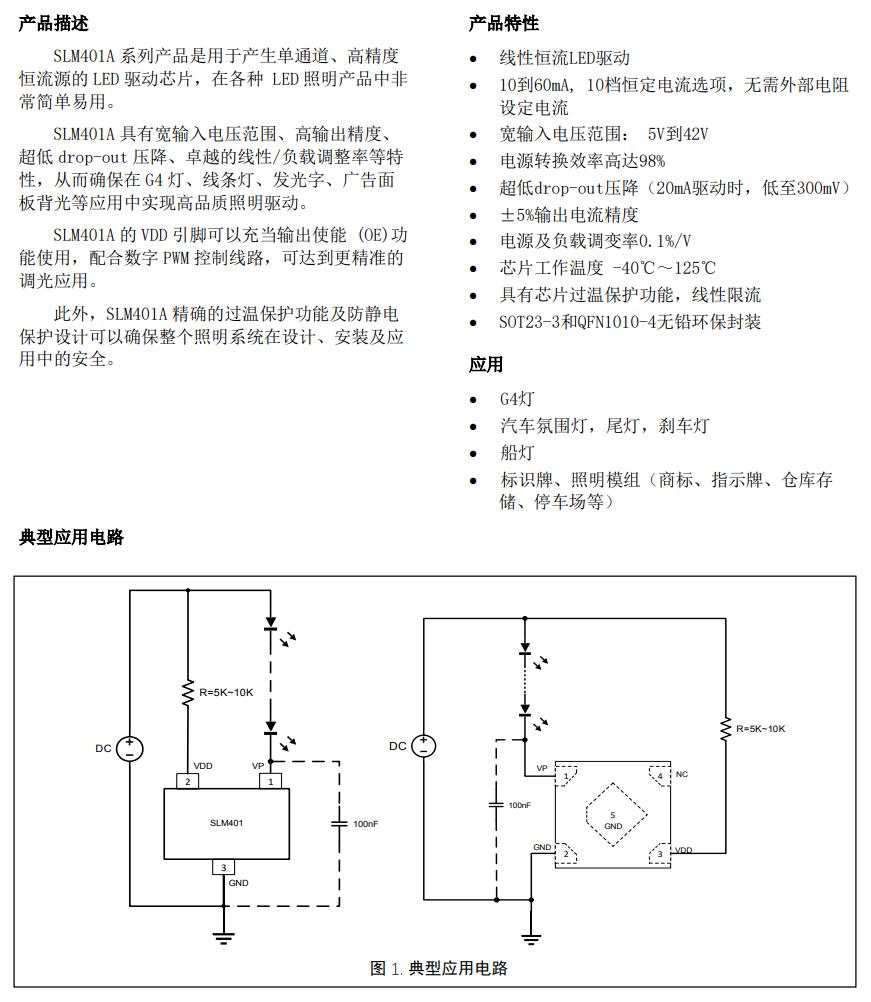 SLM401A 系列產(chǎn)品是用于產(chǎn)生單通道、高精度恒流源的 LED 驅(qū)動(dòng)芯片,在各種 LED 照明產(chǎn)品中非常簡(jiǎn)單易用。