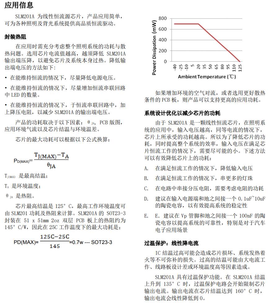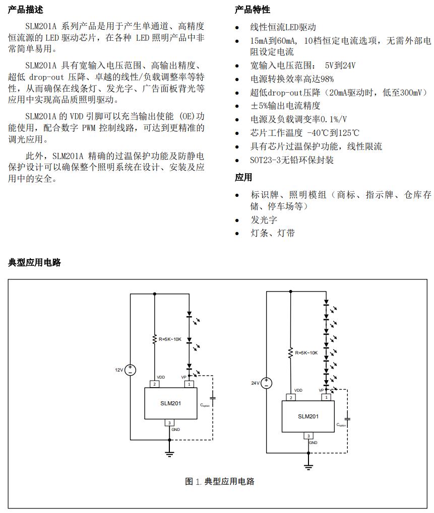 SLM201A 系列產品是用于產生單通道、高精度恒流源的 LED 驅動芯片,在各種 LED 照明產品中非常簡單用。SLM201A 具有寬輸入電壓范圍、高輸出精度、超低 drop out 壓降、卓越的線性/負載調整率等特性,從而確保在線條燈、發光字、廣告面板背光等應用中實現高品質照明驅動。SLM201A 的 VDD 引腳可以充當輸出使能 (OE)功能使用,配合數字 PWM 控制線路,可達到更精準的調光應用。此外,SLM201A 精確的過溫保護功能及防靜電保護設計可以確保整個照明系統在設計、安裝及應用中的安全。